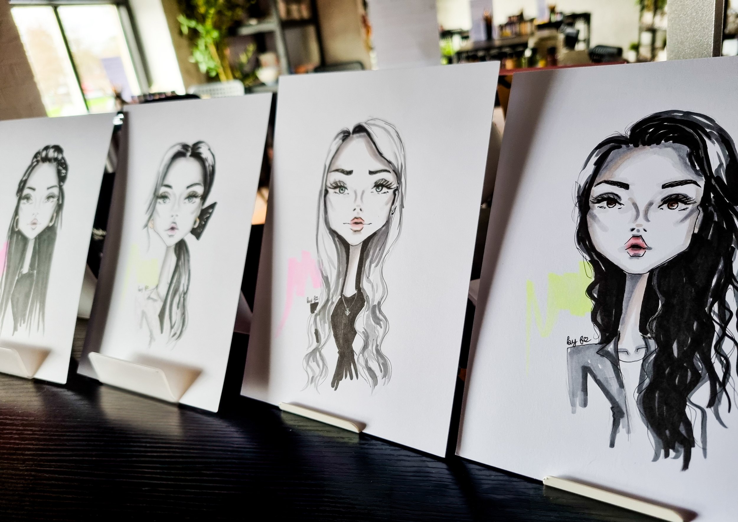 A6 postcard sizeMedium used: markers, 350gsm cardI draw from photographsApproximately 6 people per hourMinimum 3 Hours (£450) (travel outside of 20miles from the Studio subject to additional charges)50% deposit to secure your date